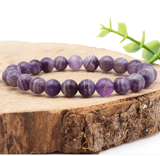 Bracelet boule en améthyste rubanée du Brésil AA, pierre d’apaisement et d’équilibre. Bijou naturel favorisant sérénité et clarté intérieure.